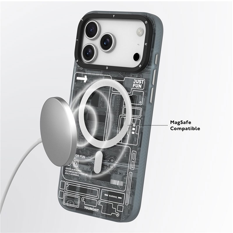 قاب Youngkit Technology Series Futuristic Circuit Grey ترکیبی بینظیر از طراحی مدرن، دوام بالا و فناوری پیشرفته است. طراحی این سری از قابها با الهام از المانهای برد الکترونیکی و سبک سایبرپانک انجام شده تا حس زندگی در دنیای تکنولوژی آینده را منتقل کند. طرح مدارهای ظریف روی قاب، جلوهای متفاوت و چشمگیر به آیفون شما میدهد و آن را به اکسسوریای خاص تبدیل میکند.