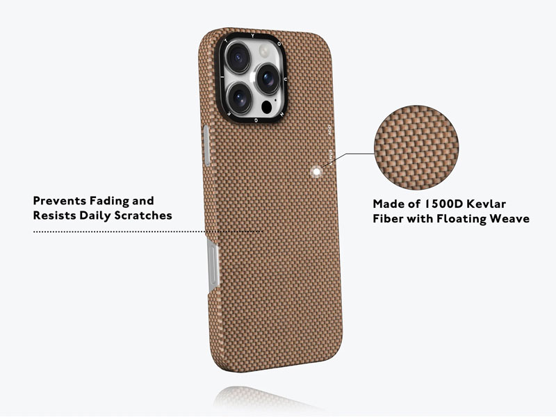 طراحی این قاب با Floating Weave (بافت شناور) نهتنها به آن ظاهری لوکس و حرفهای میدهد، بلکه مقاومت آن در برابر خط و خش، لک و محو شدن رنگ را تضمین میکند. جزئیات دقیق برشها و دکمهها، تجربه استفاده روان و بدون اختلالی را فراهم میکند، و لبههای برجسته (Raised Bezel) محافظت تکمیلی برای لنز دوربین فراهم میآورند.